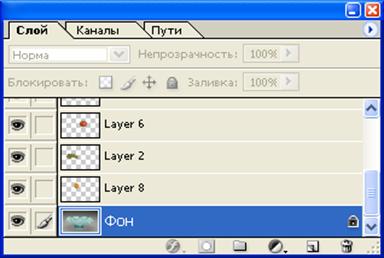Для работы со слоями есть специальная палитра Layers (рис. 10), активизируется командой Окно/Слои (Layers). На ней виден список всех слоев, с их названиями и уменьшенными изображениями. Если рядом со слоем изображен глаз, это значит, что слой включен. Если рядом со слоем изображена кисть, то значит, если вы будете заниматься редактированием, то редактировать вы будете именно этот слой. Буква Т обозначает, что слой текстовый. Текст в слоях хранится не как набор точек, а именно как текст, который можно редактировать (так будет, пока вы не сольете текст с обычным слоем). Если стоит буква f, значит, на слое есть "эффект". Опции для слоя можно задать, щелкнув на нем правой кнопкой мышки и выбрав в появившемся меню Layer Options. Здесь можно задать прозрачность слоя, режимы наложения и т. д. Естественно, слои можно удалять и создавать новые. Слои можно менять местами.