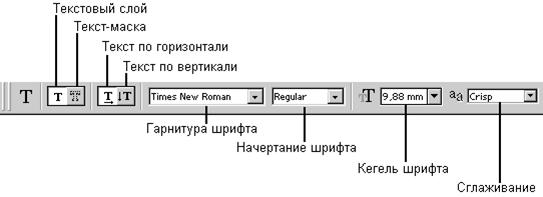 Текст создается в отдельном, текстовом слое (Text Layer). Слою можно задавать эффекты, искажать его как обычный. Все параметры данного инструмента настраиваются на соответствующей панели параметров. Здесь устанавливаются шрифт, стиль, размер шрифта, сглаживание символов, цвет текста, выравнивание, а также направление и оболочка текста.