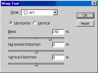 Create Warped Text— этот параметр задает искривление текста. Его удобно __ использовать при создании эмблем (логотипов) или плакатов. Можно выбрать одну из пятнадцати доступных форм контуров, тип искажения кривой и искривление. Нельзя искривить только тот текст, к которому применялись стили Faux Bold иFaux Italic. Также нельзя искривить растровые шрифты.
