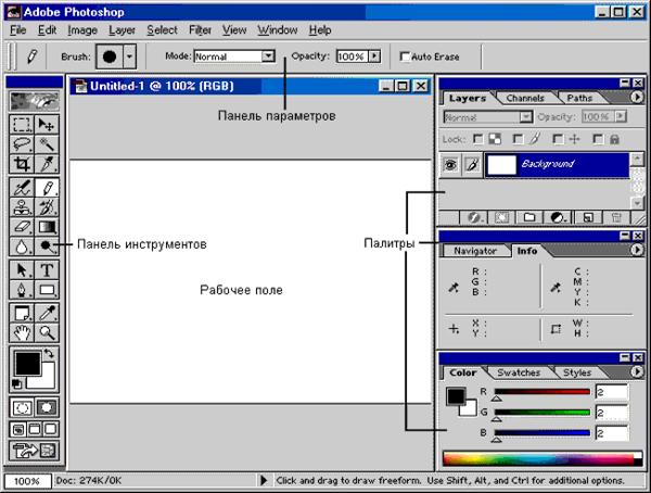 В центре рабочего окна находится рабочее поле, на котором создаются и редактируются изображения.