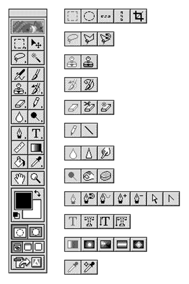 · Инструменты рисования: Кисть (Paintbrush), Историческая кисть (History Brush), Градиент (Gradient),Осветлитель (Dobge), Ластик (Eraser) , Штамп (Rubber Stamp) , Healing Brush (Восстанавливающая кисть), Размытие(Blur) ;