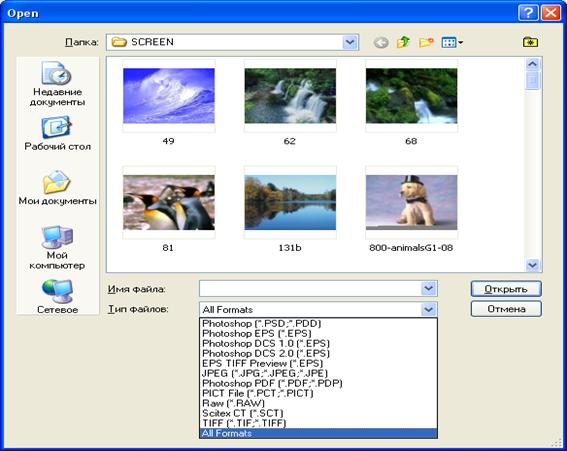 Открытие файла в Photoshop ничем не отличается от открытия файлов в любой другой программе (рис.4). Можно открыть столько изображений, сколько их сможет уместиться в ОП компьютера.