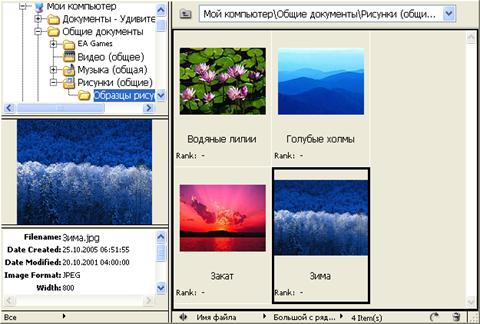 Здесь используется выпадающее меню, расположенное в верхнем правом углу диалогового окна, для выбора нужной папки (рис.6). После того как папка будет открыта, в диалоговом окне отобразятся эскизы хранящихся изображений. В верхнем левом окне находится расположение выделенного в данный момент файла. После просмотра папок и всех хранящихся в них файлов, выбирается нужный и выполняется двойной щелчок на эскизе.