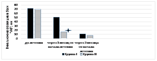 Рисунок 1. Динамика показателей шкалы боли «VAS» у пациентов I и II групп до, через 1 и 3 месяца от начала лечения