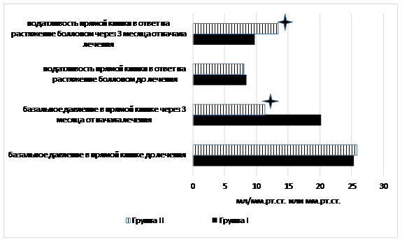 Рисунок 4. Динамика показателей сенсомоторной функции прямой кишки у пациентов I и II группы до лечения и через 3 месяца от начала лечения