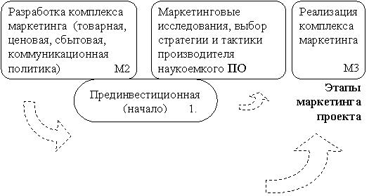 Обеспечение рыночной ориентированности проектов находится в компетенции маркетинга, значение которого – как приоритетной функции менеджмента предприятия – определенно возрастает в наукоемких отраслях промышленности: 1) он ориентирует все остальные функции на удовлетворение отраслевых рыночных потребностей потенциальных заказчиков наукоемкого ПО; 2) определяет политику производителя в ходе ЖЦ проекта (от появления идеи до сдачи готового ПО заказчику), что, в конечном счете, повышает его экономическую эффективность.
