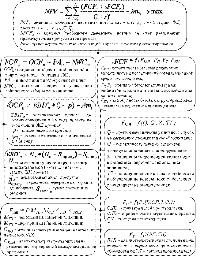 В составе критерия – новый экономический элемент – прирост свободного денежного потока по проекту (ΔFCF) за счет коммерциализации (с помощью применения инструментария маркетинговой деятельности) результатов его стадий в виде частных заказов.