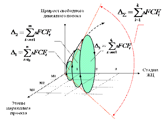 Таким образом, механизм формирования приростов свободного денежного потока по всем стадиям ЖЦ проекта с учетом изложенного рыночно-ориентированного подхода можно представить в виде схемы – рис. 5.