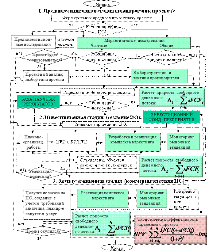 На прединвестиционной стадии ЖЦ – для создания предпосылок к обеспечению прироста свободного денежного потока – должны быть проведены маркетинговые исследования с использованием инструментов, учитывающих специфику конкретного наукоемкого проекта и отраслевого рынка.