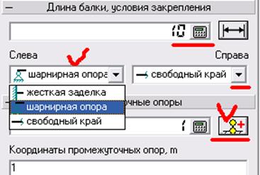 Выбираем поле выбора способа закрепления балки с левого и правого концов. Наводим курсор мыши на соответствующее поле, нажимаем левую кнопку мыши и выбираем необходимый способ закрепления, таким же образом устанавливаем промежуточные опоры.