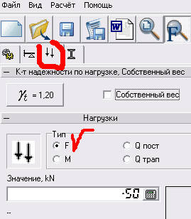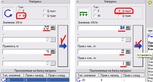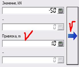Выбираем поле «значение» и вводим либо с клавиатуры, либо с помощью мыши значение силы в кН (знак минус говорит о том, что сила направлена вниз). В поле привязка указываем, на каком расстоянии от левого края балки находиться точка приложения силы, в метрах. Нажимаем кнопку установить.