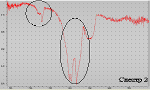 Эти два спектра отличаются друг от друга тем, что спектр 1 принадлежит алмазу малоазотному, а спектр 2 содержит значительное количество азота. О наличии примеси азота в кристалле 2 свидетельствует наличие дополнительного пика.