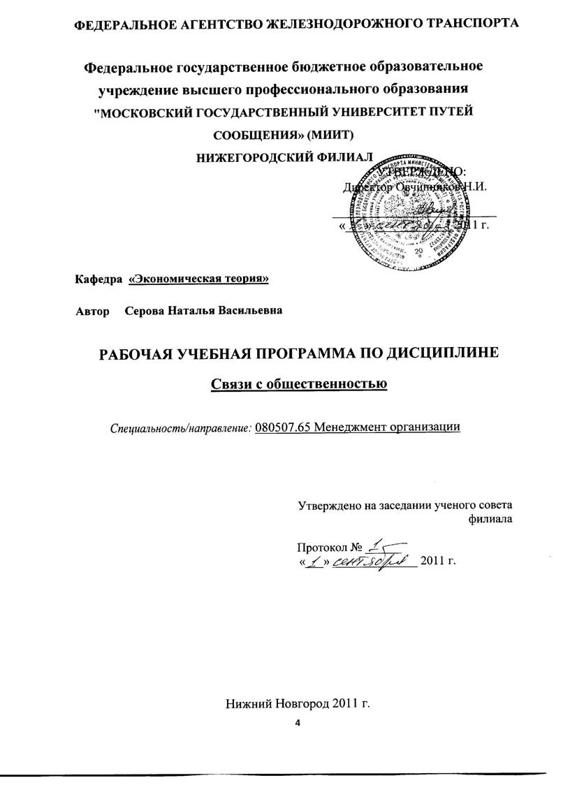 Учебно-методический комплекс по дисциплине Связи с общественностью составлен в соответствии с требованиями Государственного образовательного стандарта высшего профессионального образования по специальностям 080507.65 «Менеджмент организации». Дисциплина входит в цикл общепрофессиональных дисциплин и является дисциплиной по выбору студента. Данный учебно-методический комплекс рассмотрен и одобрен на заседании Учебно-методической комиссии РОАТ. Протокол №4 от 01.01.2001.