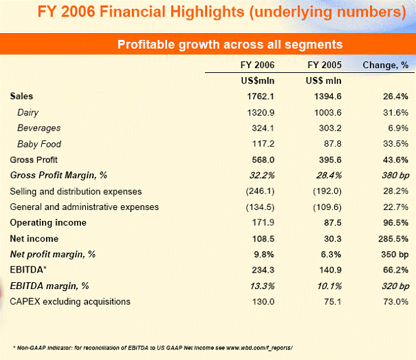 Приложение 3. Финансовые результаты компании Вимм-Билль-Данн (FY 2006)