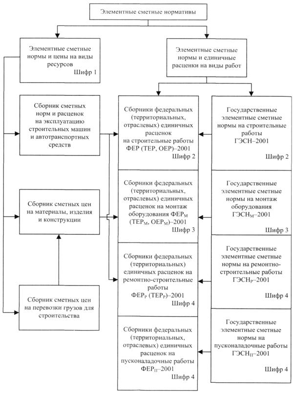 Структура действующей сметно-нормативной базы представлена на рис. 4.1. В ее составе следует выделить три блока: элементные сметные нормативы на строительные работы (ГЭСН-2001), на монтажные работы (ГЭСН-2001), на ремонтно-строительные работы (ГЭСНр-2001); на пуско-наладочные работы (ГЭСНп-2001).