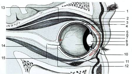 1 - Кольцевидная мышца века; 2 - Мышца, поднимающая верхнее веко; 3 – Склера; 4 - Сосудистая оболочка глаза; 5 - Конъюнктива; 6 - Радужная оболочка; 7- Роговица; 8 – Хрусталик; 9 - Стекловидное тело (прозрачно); 10 - Ресничное тело и подвешивающая связка хрусталика; 11 – сетчатка; 12 - Диск (сосочек) зрительного нерва; 13 - Прямая верхняя глазная мышца; 14 - Прямая нижняя глазная мышца; 15 - Зрительный нерв.