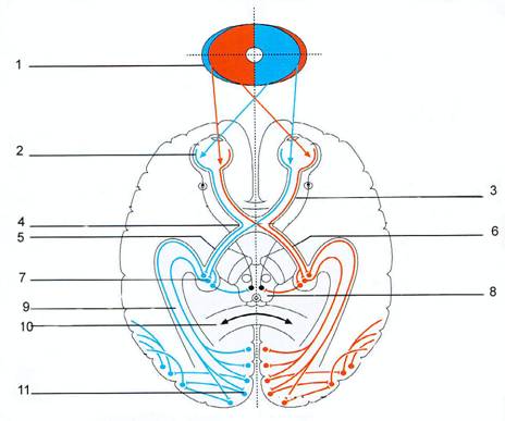 1 – Поле зрения; 2 - Сетчатка; 3 – Зрительный нерв; 4 – Зрительный перекрест (хиазма); 5 – Левый зрительный тракт (волокна, идущие от левых половин сетчатки); 6 – Правый зрительный тракт (волокна, идущие от правых половин сетчатки); 7 – Наружные коленчатые тела (подкорковый центр – первичная обработка зрительной информации); 8 – Четверохолмие (подкорковая регуляция работы органа зрения); 9 – Проводящие волокна; 10 – Комиссурные (межполушарные) волокна; 11 - зрительный центр коры больших полушарий.