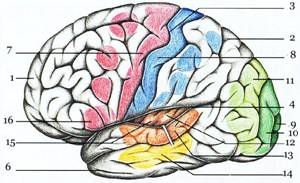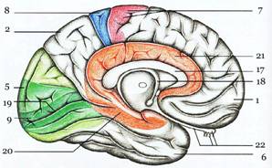 1 - Лобная доля мозга; 2 - Теменная доля; 3 - Центральная борозда; 4 - Боковая борозда; 5 - Затылочная доля; 6 - Височная доля; 7 - Прецентральная извилина - центр координации движений; 8 - Позадицентральная извилина-центр сознательного восприятия; 9 - Первичный зрительный центр (участок зрительного восприятия); 10 - Вторичный зрительный центр - участок коры, ведающий "пониманием" визуальных впечатлений; 11 - Третичный зрительный центр - участок коры, ведающий отбором и запоминанием зрительных впечатлений; 12 - Первичный акустический центр; 13 - Вторичный акустический центр (участок коры, ведающий идентификацией слуховых впечатлений) с речевым центром Вернике; 14 - Третичный акустический центр - участок коры, ведающий запоминанием слуховых впечатлений; 15 - Островок; 16 - Двигательный речевой центр (центр Брока) - при праворукости находится только в левом полушарии; 17 - Мозолистое тело - содержит нервные пути, соединяющие друг с другом центры правого и левого полушарий (так наз. комиссурные пути); 18 - Свод мозга (изогнутый тяж из нервных волокон, относящихся к лимбической системе);19 - Шпорная борозда (первичный зрительный центр); 20 - гиппокамп (часть лимбической системы); 21 - Cingulum (часть лимбической системы); 22 - Обонятельные нервы, обонятельная доля и обонятельный путь