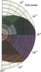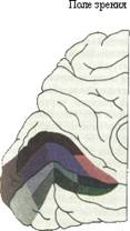 Рис. . Зоны поля зрения и их проекция на кору головного мозга. Когда зрительная информация, получаемая ганглиозными клетками сетчатки, передается первичной зрительной коре, она распределяется там в соответствии с локализацией ее источников в сетчатке. Образы, воспринимаемые в районе центральной ямки - в зоне максимальной плотности палочек и наивысшей остроты зрения - проецируются на значительно большую область зрительной коры, чем образы, воспринимаемые периферией сетчатки.