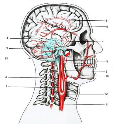 Головной мозг снабжается кровью из двух систем артерий – позвоночных и внутренних сонных. Позвоночные артерии, ответвляясь от подключичных, проходят в отверстиях поперечных отростков шейных позвонков и, проникнув в полость черепа, соединяются в общий ствол базилярной артерии, которая снабжает кровью мозжечок, продолговатый мозг и затылочные отделы мозга. Внутренняя сонная артерия, начавшись от общей сонной артерии, поднимается к основанию черепа и входит в специальный канал височной кости, через который она попадает в полость черепа и дает там ветви, кровоснабжающие глаза и все остальные отделы головного мозга.