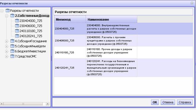 Далее в открывшемся окне нажимаем левой кнопкой мыши на кнопку […] , и из предложенного списка выбираем нужный разрез отчетности.