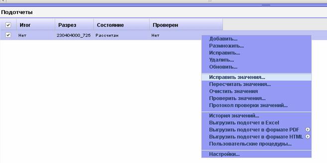 После добавления необходимых подотчетов можно приступить к их заполнению (редактированию). Для этого выберите из списка строку с нужным подотчетом и кликните по ней два раза левой кнопкой мыши, либо в контекстном меню выберите пункт «Исправить значения».
