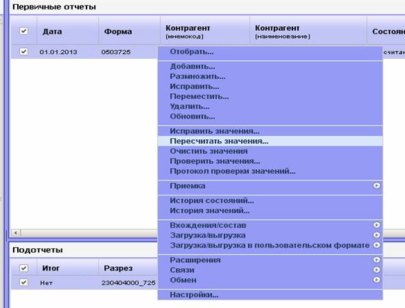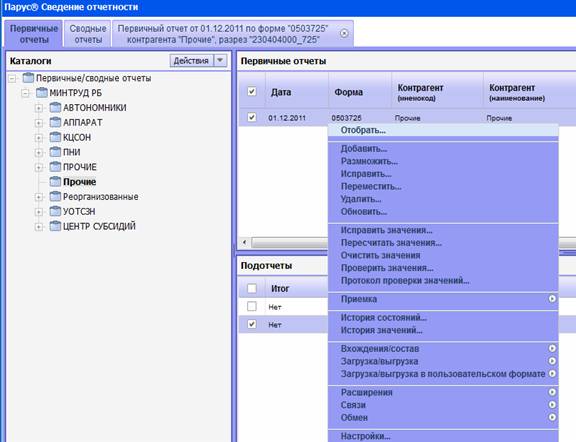 Для пользователя предусмотрены дополнительные действия, применимые как к одному, так и к нескольким отчетам или подотчетам. Для выбора нескольких отчетов следует в списке отчетов нажать клавишу Ctrl и далее отметить щелчком левой клавиши мыши нужные отчеты. После выбора отчетов можно вызвать нажатием правой кнопки мыши контекстное меню, в котором будет список доступных действий.