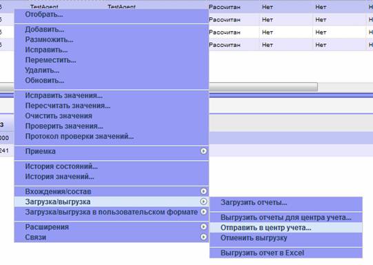 Для отправки отчета предусмотрен пункт контекстного меню «Загрузка/выгрузка – Отправить в центр учета». После отправки отчет не доступен для редактирования. Внести изменения в отчет можно только после отмены отправки.
