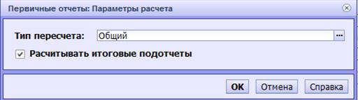 Действие предназначено для пересчета значений отчета. При выборе действия появится окно параметров расчета. Здесь необходимо выбрать тип пересчета. Для каждой формы действуют только определенные пересчеты.