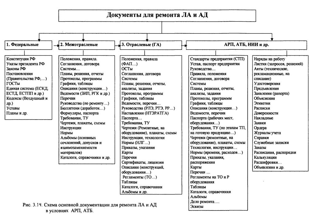 Вся документация, применяемая при ремонте AT, составляет значительный перечень и обладает юридической силой, носит производственный (технологический, обеспечивающий и обслуживающий) характер, отражает финансово-экономические взаимоотношения и социальные основы предприятий ГА. Общий перечень используемой в авиаремонтном производстве основной документации представлен на рис. 3.14. А в табл. приведены: перечень основной нормативно-технической (технологической) документации для ремонта ЛА, АД и их агрегатов в АРП, АТБ; участники разработки этой документации и сокращения слов - её наименований; кодирование, последовательность разработки и введения в действие основной НТД.