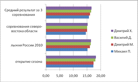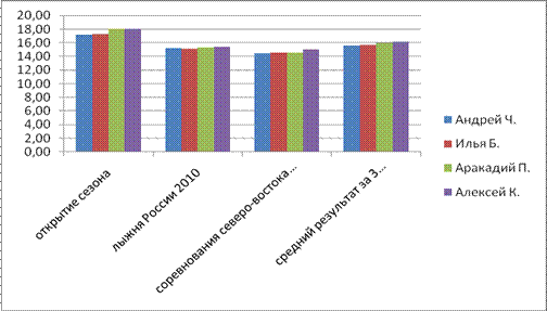 имя, фамилия | открытие сезона | «Лыжня России» 2010 | соревнования северо-востока области | Средний результат за 3 соревнования |