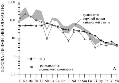 Распределение рассеянных элементов в вулканических породах верхней пачки кайласской свиты наглядно иллюстрирует мультикомпонентная спайдер-диаграмма (рис. 1А).