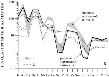 По характеру распределения рассеянных элементов среди риолитов тургинской свиты выделяются два типа (рис.1Б). Первый тип риолитов (I) характеризуется высокими относительно примитивной мантии концентрациями К, Th, U, LREE, Zr и глубокими минимумами Ba, Nb, Eu и Ti. Более низкие содержания LREE (в том числе, ярко выраженный глубокий Eu-минимум) Zr, отсутствие глубокой аномалии по Ba и более высокие значения Th и U определяют геохимические различия риолитов второго (II) от первого типа (рис. 1Б).