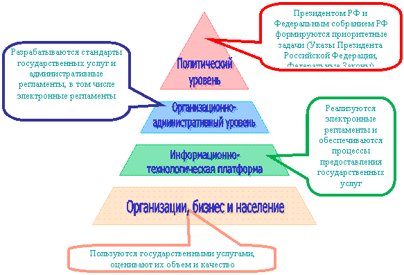 Обеспечение функционирования и взаимодействия всех уровней этой модели осуществляет информационно-технологическая платформа, структура и базовые технологии которой создают электронную среду информационного взаимодействия, обеспечивающую реализацию задач «электронного государства».