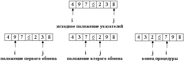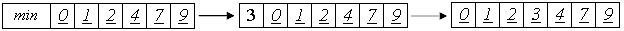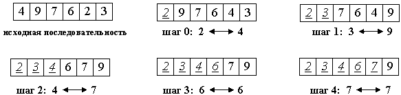 Будем строить готовую последовательность, начиная с левого конца массива. Алгоритм состоит из n последовательных шагов, начиная от нулевого и заканчивая (n-1)-м.