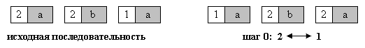 Результат ее сортировки можно увидеть уже после шага 0, так как больше обменов не будет. Порядок ключей 2a, 2b был изменен на 2b, 2a, так что метод неустойчив.