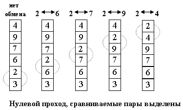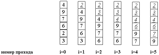 После нулевого прохода по массиву "вверху" оказывается самый "легкий" элемент - отсюда аналогия с пузырьком. Следующий проход делается до второго сверху элемента, таким образом второй по величине элемент поднимается на правильную позицию...