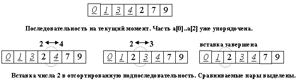 Однако в сортировке пузырьком или выбором можно было четко заявить, что на i-м шаге элементы a[0]...a[i] стоят на правильных местах и никуда более не переместятся. Здесь же подобное утверждение будет более слабым: последовательность a[0]...a[i] упорядочена. При этом по ходу алгоритма в нее будут вставляться (см. название метода) все новые элементы.