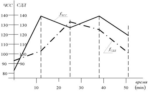 На основании результатов измерений построены графики, представленные на рисунках 1, 2 и 3. Из анализа этих графиков следует, что отсутствие адекватности изменений ЧСС = f1(t) и СДД = f2(t) наблюдается лишь в рамках ВПН-1, причем на ограниченном интервале времени (12мин – 38мин). Во всех остальных случаях (ВПН-2, ВПН-3) изменения ЧСС = f1(t) и СДД =f2(t) адекватны друг другу в течение всего периода тренировки.