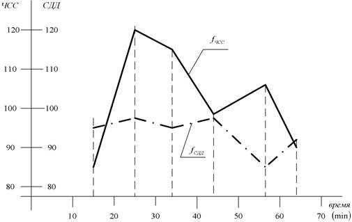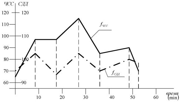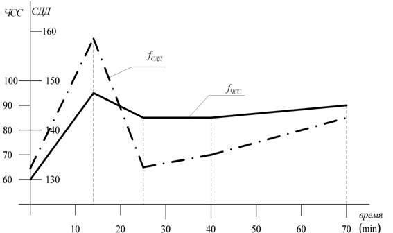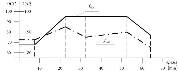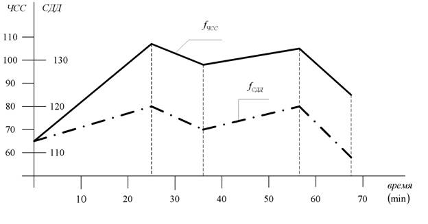 занятий (ВПН-2, рисунок 5), измерения показывают наступление состояния, близкого к адекватности функций ЧСС = f1(t) и СДД = f2(t), в том числе и в конце занятий. Наконец, после 13 месяцев тренировок (ВПН-3, рисунок 6) адекватность ЧСС и СДД наблюдается в течение всей тренировки. Это свидетельствует о доступном состоянии управляемости относительно взаимодействия физиологических функциональных систем поддержания сердечного ритма (ЧСС) и артериального давления (СДД), несмотря на имеющиеся сложности функционирования организма, связанные ожирением второй степени и тонзиллитом.