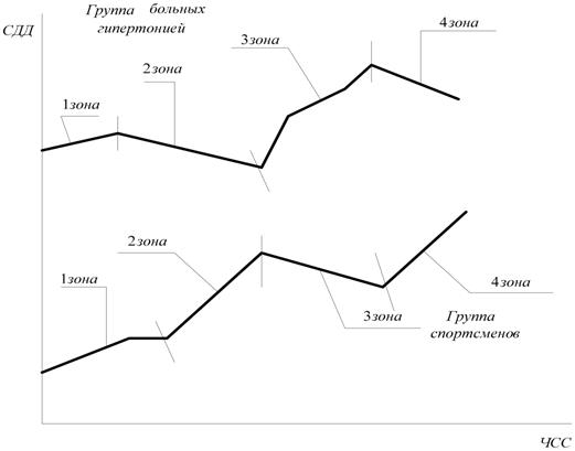 также имеет характер экстремума (max) при переходе от зоны 3 к зоне 4. Таким образом, для спортсменов можно рекомендовать интенсифицировать нагружение с ростом ЧСС и СДД на 10% относительно экстремума (min). Для всех остальных участников тренировок – снижение интенсивности нагрузок по паре (ЧСС, СДД) на 10% относительно экстремума (max). В обоих случаях