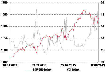 Между тем, в конце недели настроения на мировых рынках несколько улучшились, что позволило ведущим фондовым индексам продемонстрировать неплохой отскок. Поводом для покупок стали лучшие, чем ожидалось, данные по розничным продажам и заявкам на пособия по безработице в США в сочетании с публикацией в WSJ, согласно которой ФРС на заседании 18-19 июня не станет менять параметры программы QE. В принципе то, что Федрезерв пока воздержится от ужесточения своей монетарной политике, понятно и так. Согласно высказываниям Б. Бернанке и большинства других представителей Федрезерва, американскому регулятору потребуется еще несколько месяцев, чтобы оценить устойчивость текущего восстановления экономики США, и только потом можно будет говорить о возможной корректировке программ выкупа облигаций. Тем не менее, мы ожидаем, что как минимум до заседания ФРС высокая волатильность на мировых финансовых рынках сохранится. В то же время в своем выступлении по итогам заседания Б. Бернанке, вероятно, успокоит инвесторов, разъяснив, что программы стимулирования будут сокращаться плавно и постепенно. Это должно будет способствовать улучшению ситуации на мировых фондовых площадках, коррекция на которых продолжается уже четыре недели.