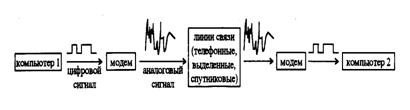 Сигналы, распространяющиеся в телефонных линиях, имеют непрерывный характер. Источнику такой «непрерывной» информации соответствует природный объект, поэтому говорят об «аналоговых» сигналах в телефонных линиях. Примером аналоговых сигналов может являться, например, голос человека или электромагнитное излучение. В компьютере сигналы имеют прерывный, дискретный характер, так как соответствуют информации, закодированной последо-вательностями из 0 и 1. Поэтому в связи с тем, что телефонные компании используют аналоговое оборудование, для подсоединения компьютеров к телефонным линиям используют модем. Одна из важных характеристик модема — скорость передачи данных. Ее можно определить числом модуляций сигнала в секунду и измерять в бодах. Для современных модемов характерна скорость не менее 14400 бод. Но можно говорить о скорости как количестве передаваемых в единицу времени двоичных сигналов — битов в секунду (бит/с). Скоростные модемы, использующие сжатие данных при передаче, могут передавать до 33600 бит/с - максимальной пропускной способности телефонных коммутируемых каналов. Правда, в последнее время появились технологии, позволяющие развивать скорости 57600 бит/с и выше за счёт инкапсуляции (вложения) нескольких телефонных каналов в один. На скорость передачи данных влияет также выбор линий связи. Так, при использовании коммутируемых, т.е. обычных телефонных, линий, когда модем подключен параллельно к телефонному аппарату, а аппарат их не занимает, скорость передачи данных составляет всего несколько тысяч бод. При выделенных линиях связи скорость передачи данных — до нескольких десятков тысяч бит/c. Эти линии выгодны при передаче больших объемов информации или — ввиду постоянной их подключенности — срочной передачи данных. С использованием таких линий связи действует, например, система резервирования и продажи билетов. Использование спутниковой связи и каналов цифровой передачи информации повышает пропускную способность до сотен килобит/c.