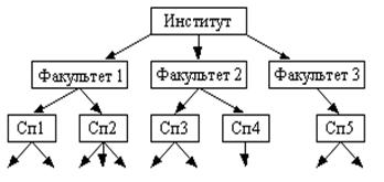Иерархически организованные данные встречаются в повседневной жизни очень часто. Например, структура высшего учебного заведения – это многоуровневая иерархия (см. рис. 2.5). Иерархическая (древовидная) БД состоит из упорядоченного набора деревьев; более точно, из упорядоченного набора нескольких экземпляров одного типа дерева. В этой модели исходные элементы порождают другие элементы, причем эти элементы в свою очередь порождают следующие элементы. Каждый порожденный элемент имеет только один порождающий элемент.