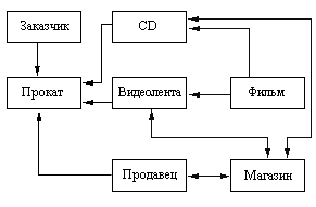 На рис.2.6 приведена схема предметной области для базы данных, в которой хранится информация о заказах магазина. Заказчики берут напрокат фильмы, используя два носителя: видеоленту и компакт-диски. Обслуживание заказчиков выполняют продавцы. Каждый продавец обслуживает многих заказчиков. Каждый продавец может пользоваться услугами нескольких магазинов и наоборот. Существует много копий одного и того же фильма и т. д.