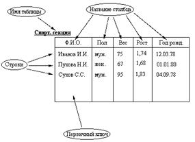 Таблица состоит из столбцов (полей) и строк (записей), имеет имя, уникальное внутри базы данных. Таблица отражает тип объекта реального мира (сущность), а каждая ее строка - конкретный объект. Так, таблица «Спортивная секция» содержит сведения обо всех детях, занимающихся в данной спортивной секции, а ее строки представляют собой набор значений атрибутов каждого конкретного ребёнка. Каждый столбец таблицы - это совокупность значений конкретного атрибута объекта. Столбец «Вес», например, представляет собой совокупность всех весовых категорий детей, занимающихся в секции. В столбце «Пол» могут содержаться только два различных значения: «муж.» и «жен.». Значения данных выбираются из множества всех возможных значений атрибута объекта, которое называется доменом (domain). Так, значения в столбце Вес выбираются из множества всех возможных весов детей.