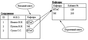 Взаимосвязь таблиц является важнейшим элементом реляционной модели данных. Она поддерживается внешними ключами (foreign key). Рассмотрим пример. В базе данных содержатся сведения о различных кафедрах университета (таблица Кафедры), а также сведения о работниках этих кафедр (таблица Сотрудники). Первичным ключом таблицы «Сотрудники» является поле ID, а таблицы Кафедры – поле «Кафедра». Поле «Кафедра» таблицы «Сотрудники» является внешним ключом для связи с таблицей «Кафедры» (рис.2.8.).