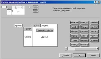 При составлении сводных таблиц следует выполнять операции согласно указаниям мастера сводных таблиц, который вызывается из главного меню «Данные» => «Сводная таблица». На рис. 5.7. изображен макет сводной таблицы для определения ежедневных и месячных пробегов автомобилей. Это один из шагов мастера сводных таблиц. Ежедневные пробеги необходимы в дальнейшем для планирования технического обслуживания (ТО) автомобилей и могут переноситься в другой, связанный файл с названием, например, «Лицевые карточки автомобилей».