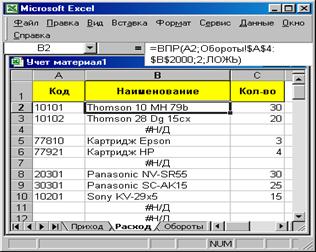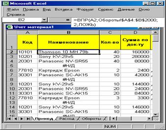 В нашем случае ячейка А2 листа «Приход» содержит код объекта учета (вида материальной ценности). Диапазон «Обороты!$A$4:$B$2000» содержит два столбца. В первом (А) находятся коды материальных ценностей. Один из этих кодов обязательно должен совпадать с кодом, который имеется в строке приходного документа на листе «Приход». Во втором столбце (В) листа «Обороты», находятся названия материальных ценностей. Таким образом, функция ВПР в приведенной нами форме ищет название кода, указанного при вводе приходного документа, и возвращает наименование соответствующего объекта. Если код в справочнике на листе «Обороты» не найден, то в соответствующей ячейке столбца В наименование не появится. При поступлении нового вида материальных ценностей сведения о нем обязательно предварительно должны вводиться в справочник (лист «Обороты»).