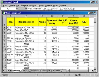 Для решения поставленной задачи модифицируем таблицу приходов таким образом, чтобы при необходимости Excel автоматически вычислял стоимость ТМЦ, выделяя из общей суммы НДС, и оставлял сумму без изменений в тех случаях, когда введенные данные не включают НДС.